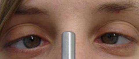 pide al pacientes que mire un objeto colocado en el entrecejo